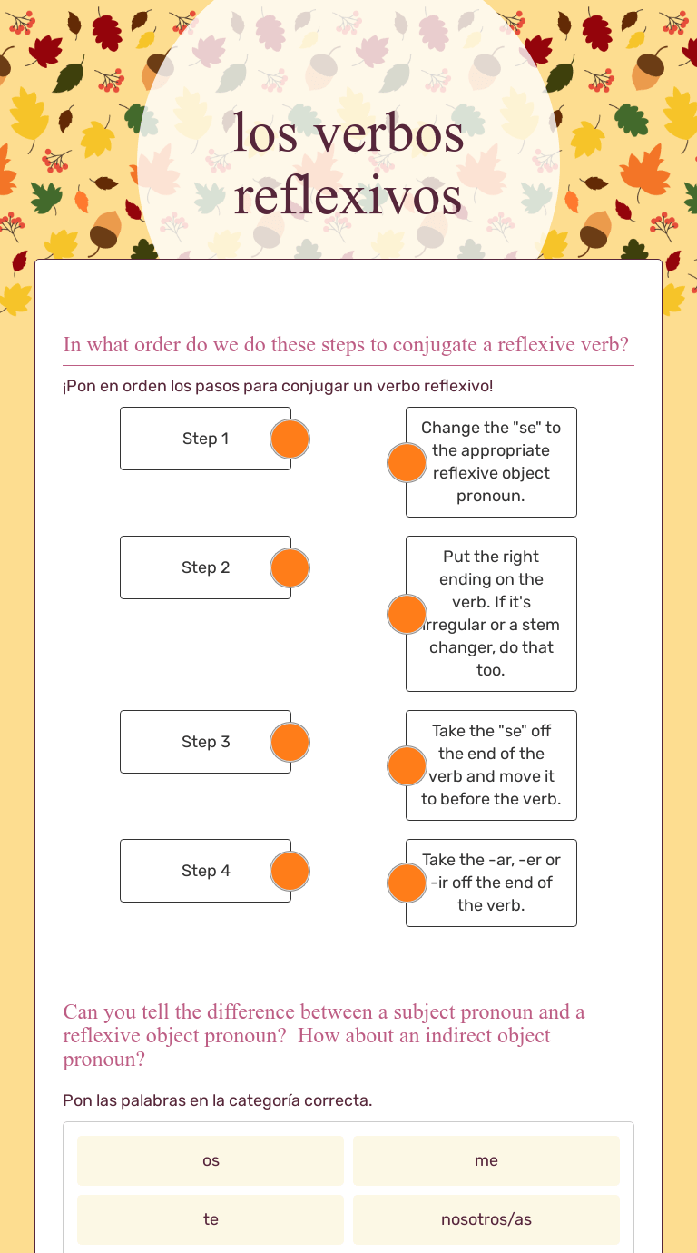 Answers to guided notes packet (fill in the blanks) is included! These reflexive verb units include . Check your answers using the answer keys provided at the front of the room or in the teacher's edition (especially. Los verbos reflexivos or spanish reflexive verbs are a special type of verbs whose action reflects back on the subject. Use lower case for all answers.